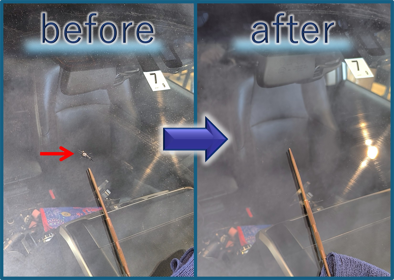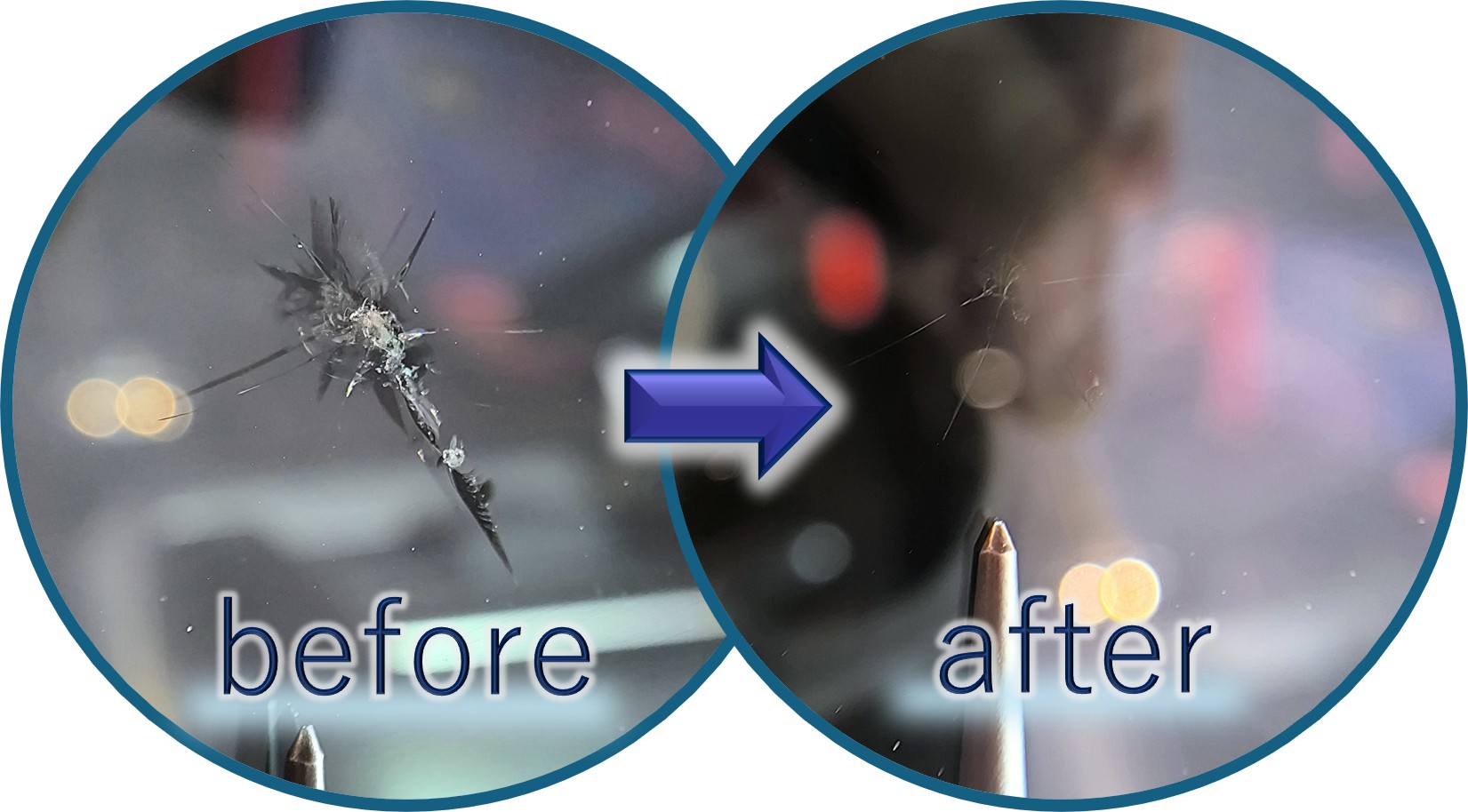 樹脂で埋め固めるのでヒビの形の痕跡が残るものの、それでもかなり目立たなくなるのも嬉しいポイント。目立たなくなれば車検に通る可能性も高まります。