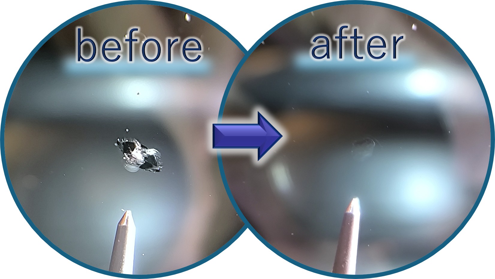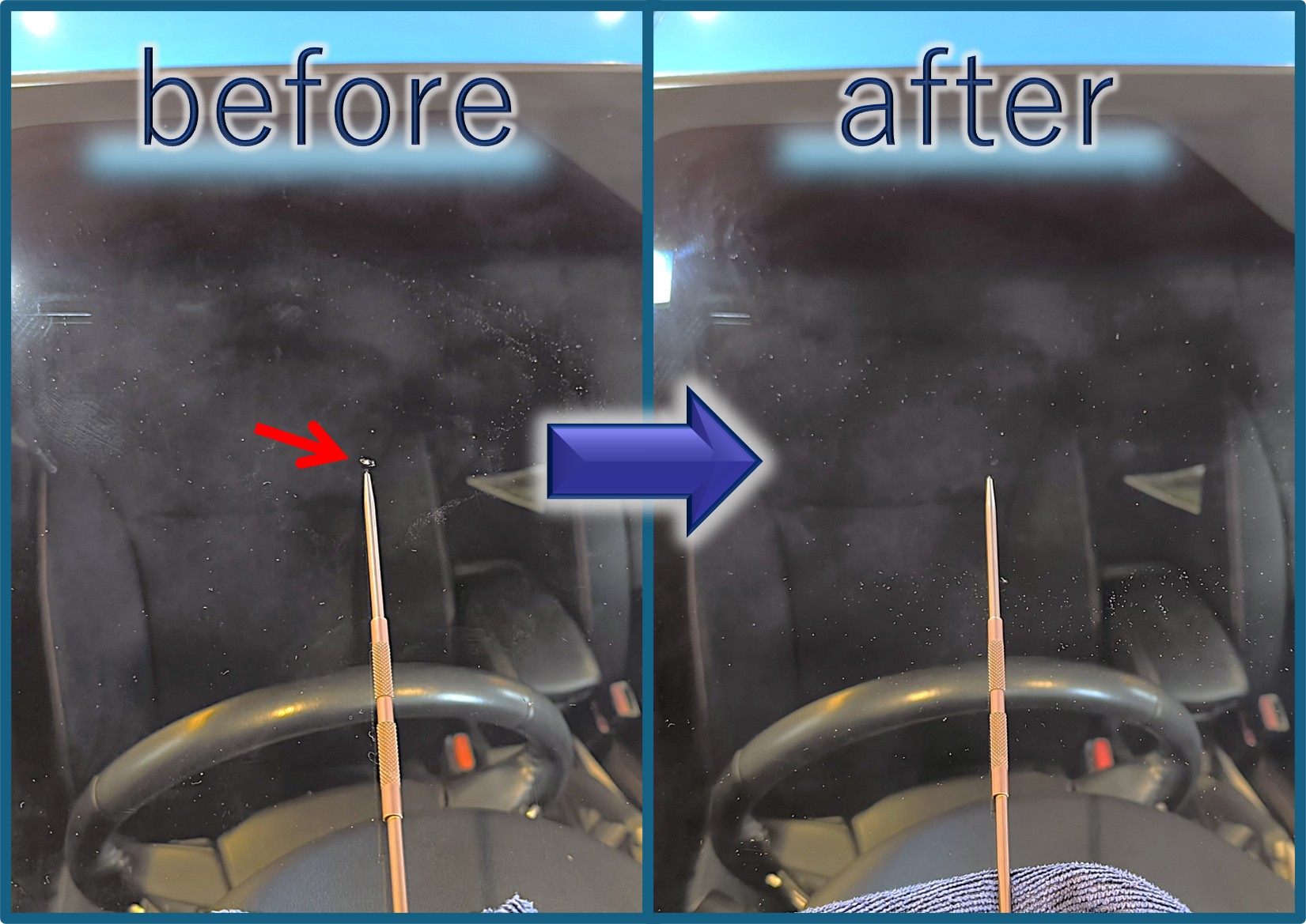 こうした飛び石ヒビ、全体が硬貨やペットボトルの蓋で隠れる程度までのサイズであればほとんどのケースでリペア可能です。施工時間は通常60分程度。施工が終わったらすぐに乗って帰れます。