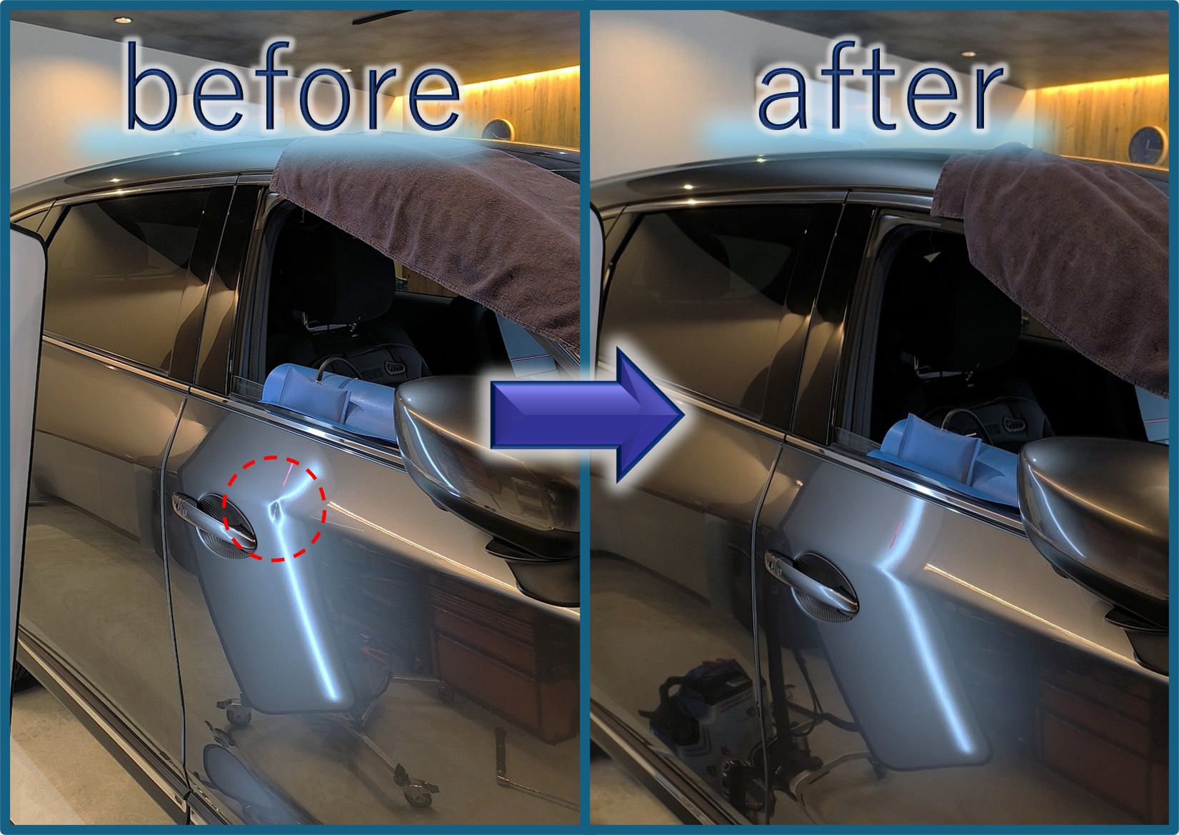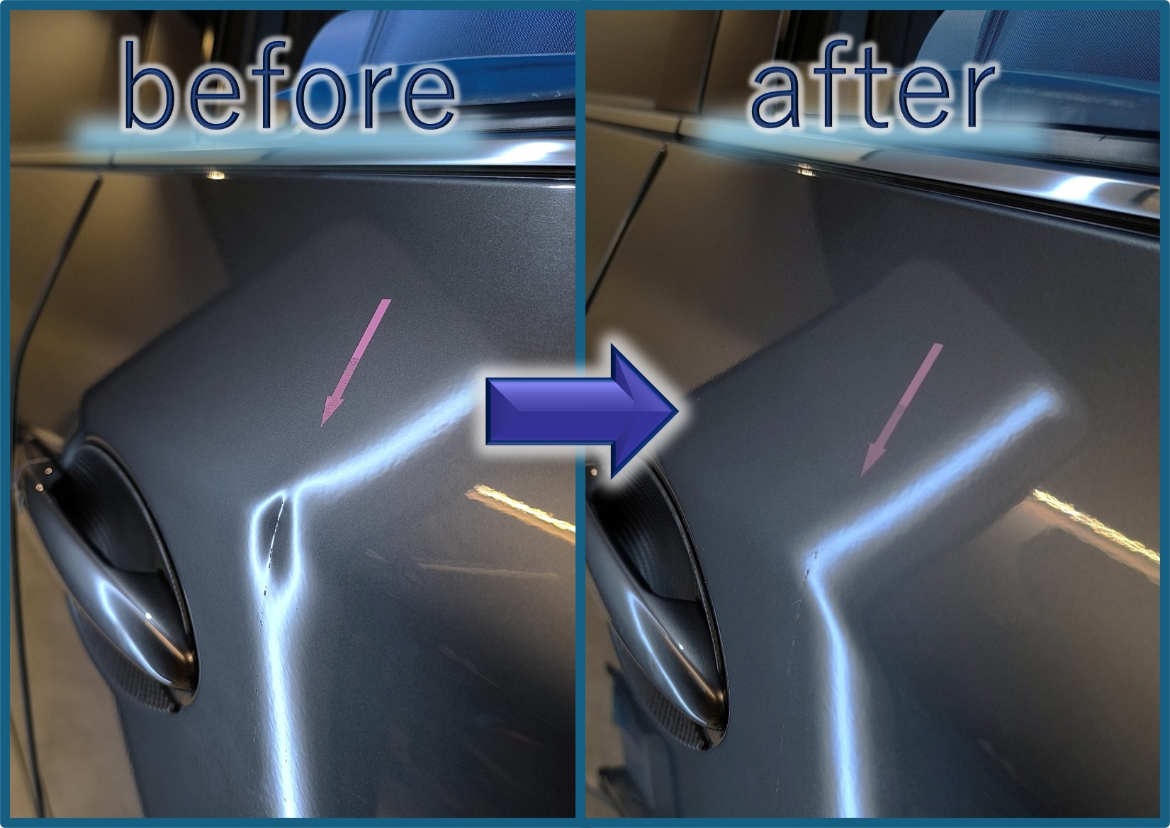 「ドア交換」や「板金修理」と判断されがちな凹みでしたが、デントリペアで対応できたことによって再塗装やパテ埋めはナシ、短時間で凹みが消えました。