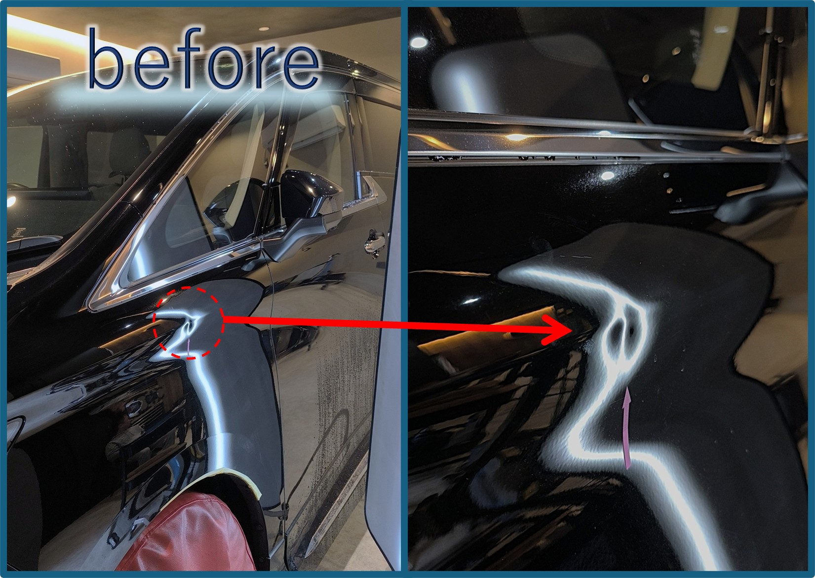 40アルファード、フロントフェンダーの、このプレスライン凹みのご依頼は多いですが、リペア工具を差し込むタイヤハウスから少し離れているのでちょっと直しにくい位置でもあります (^^;