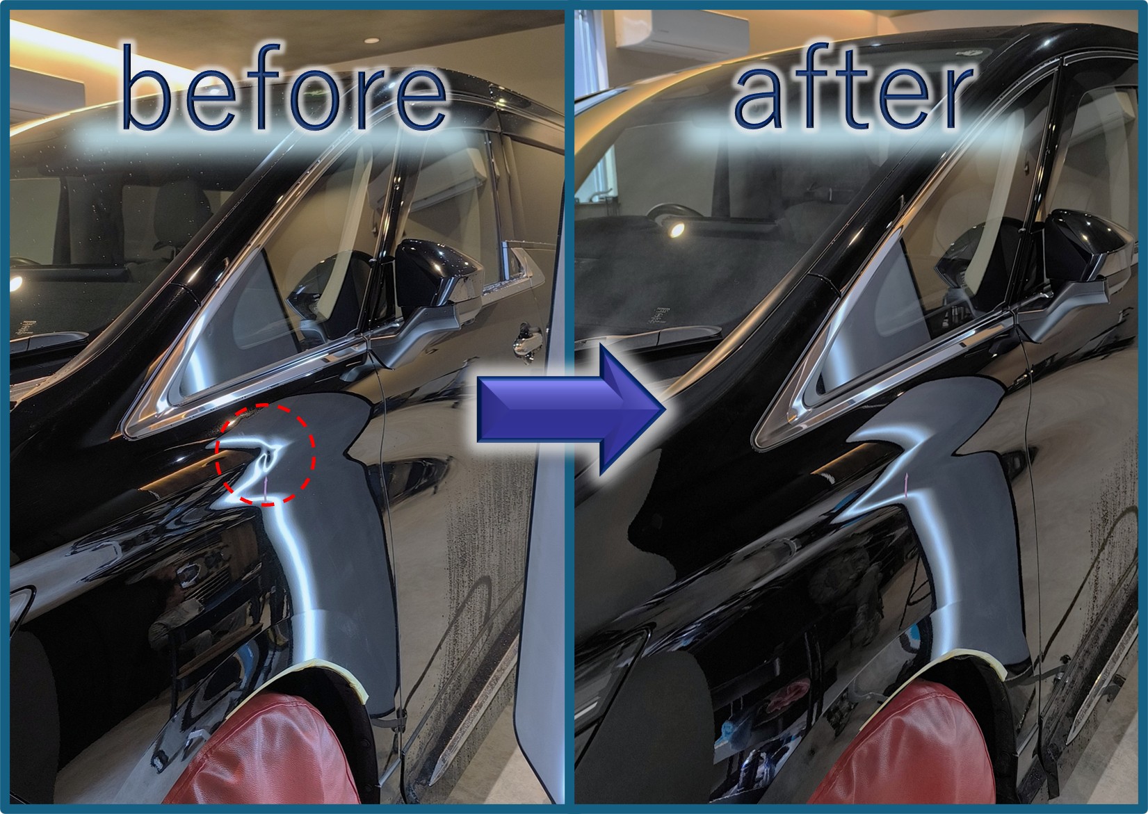 40アルファード、フロントフェンダーの、このプレスライン凹みのご依頼は多いですが、リペア工具を差し込むタイヤハウスから少し離れているのでちょっと直しにくい位置でもあります (^^;