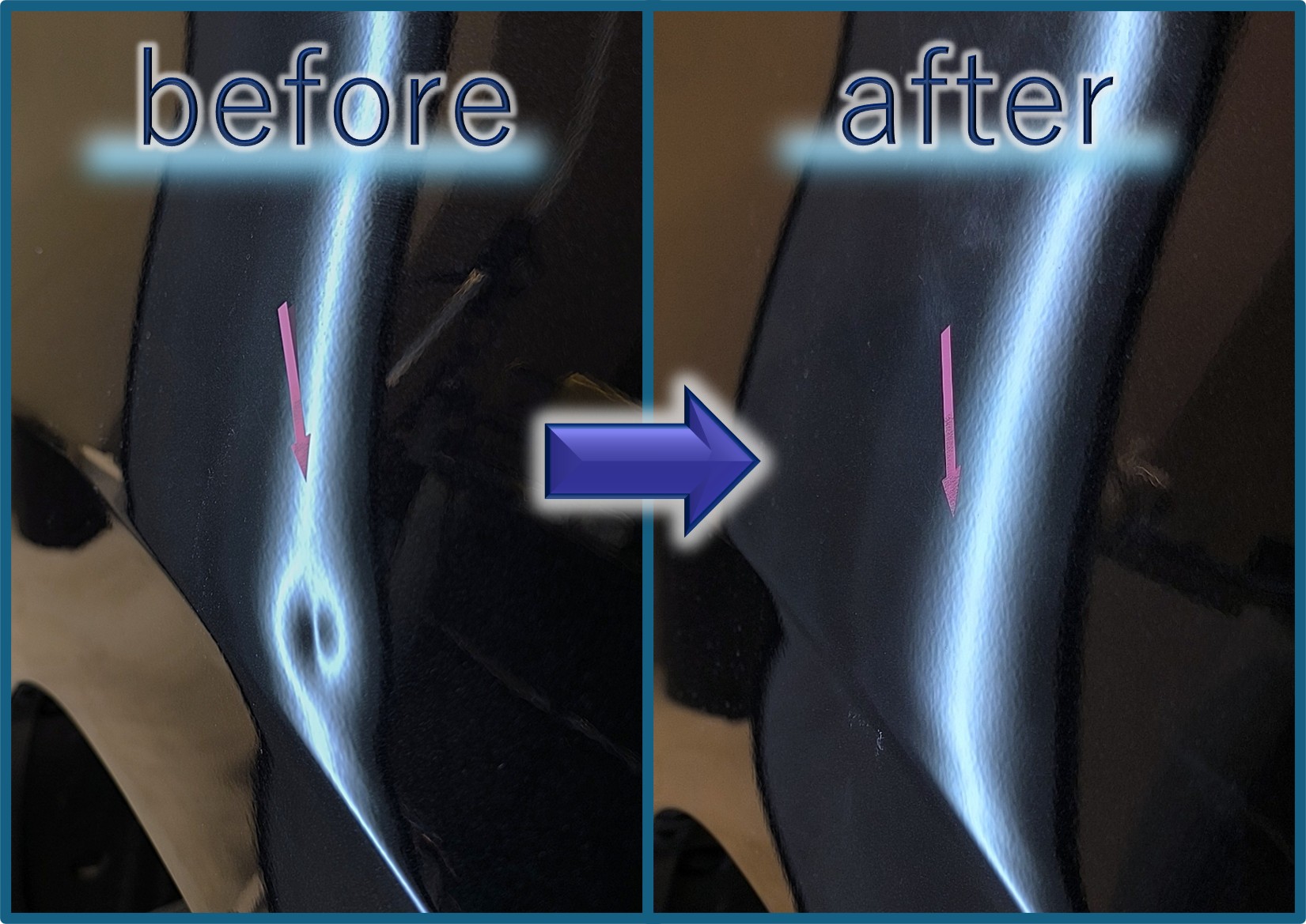 今回のように「塗装傷の無いドアパンチ被害」などは、まさにデントリペアでの修復が最適。