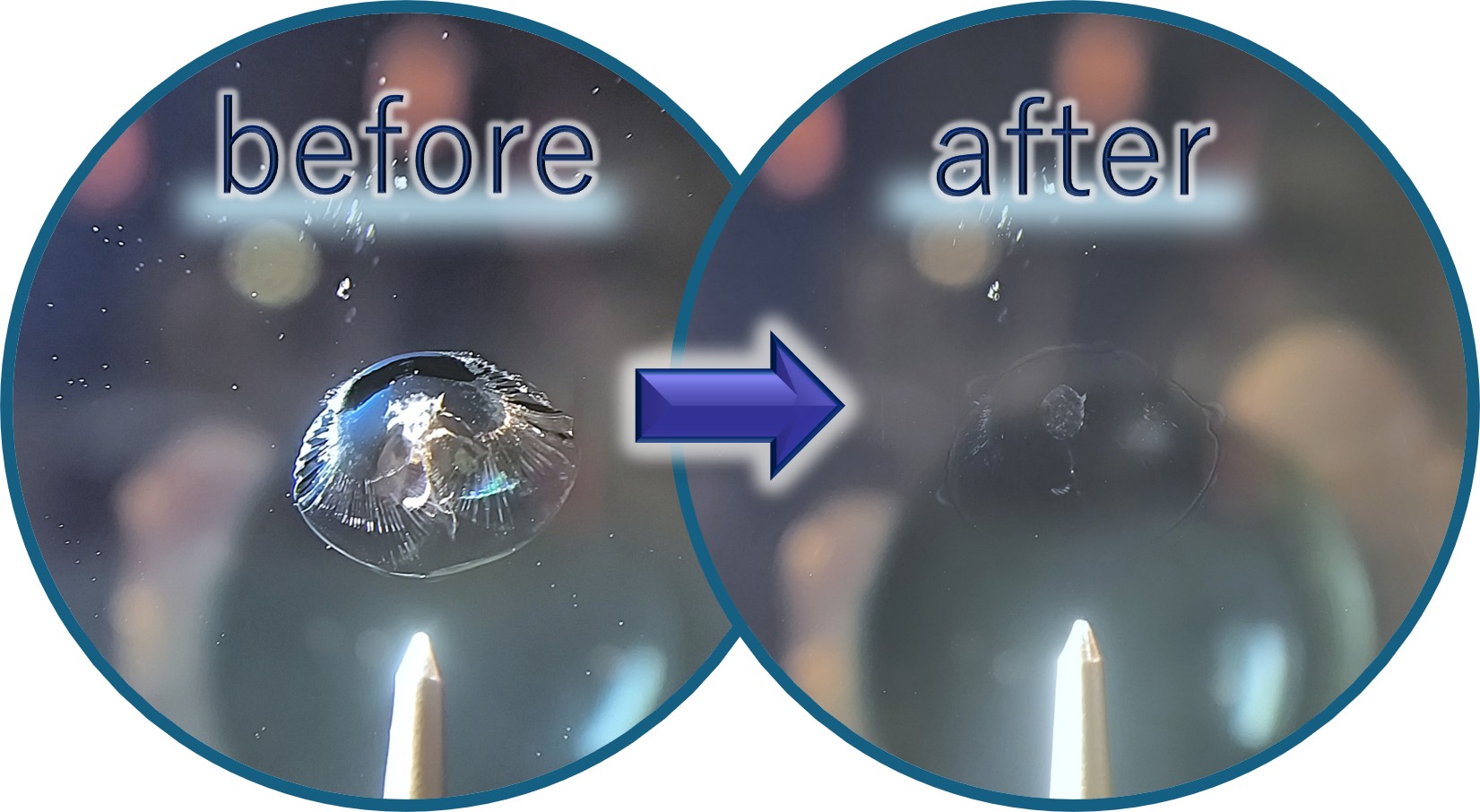 ヒビのリペアを行う際は内部に入ってしまっている空気を完全に抜き取ってリペア樹脂に置き換える必要がありますが、この「剥離型面割れ」タイプは内部に入っている空気が多いので、完全に抜いて隅々まで樹脂で満たすことに注意が必要です。