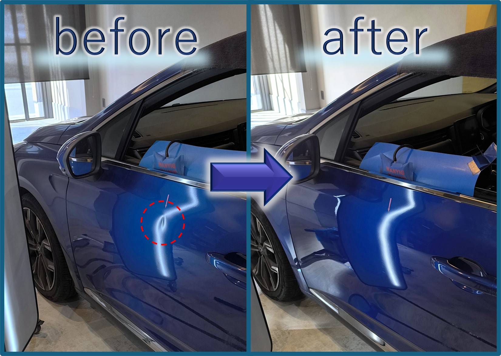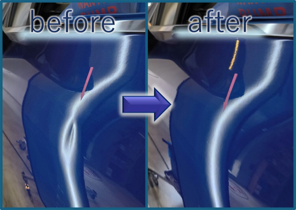 デントリペアなので、もちろんパテ埋めや再塗装はしません。裏から押してこんなふうに元に戻るなんて不思議ですよね。