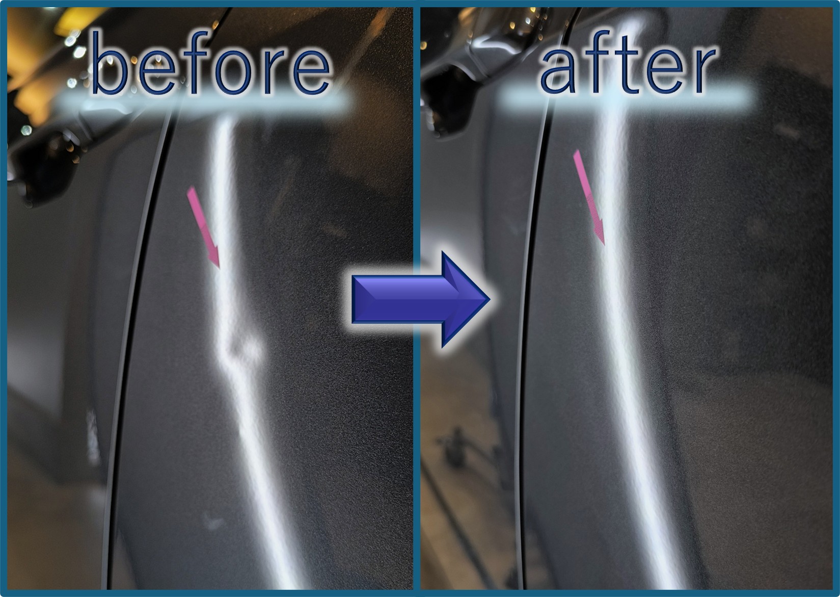 塗装を剥がしてパテ埋めしたり再塗装したりという工程が無いのでオリジナルの塗装が保たれるうえ、その場で直るのでお車を何日も預ける必要がない。これがデントリペアという技術の良いところです。