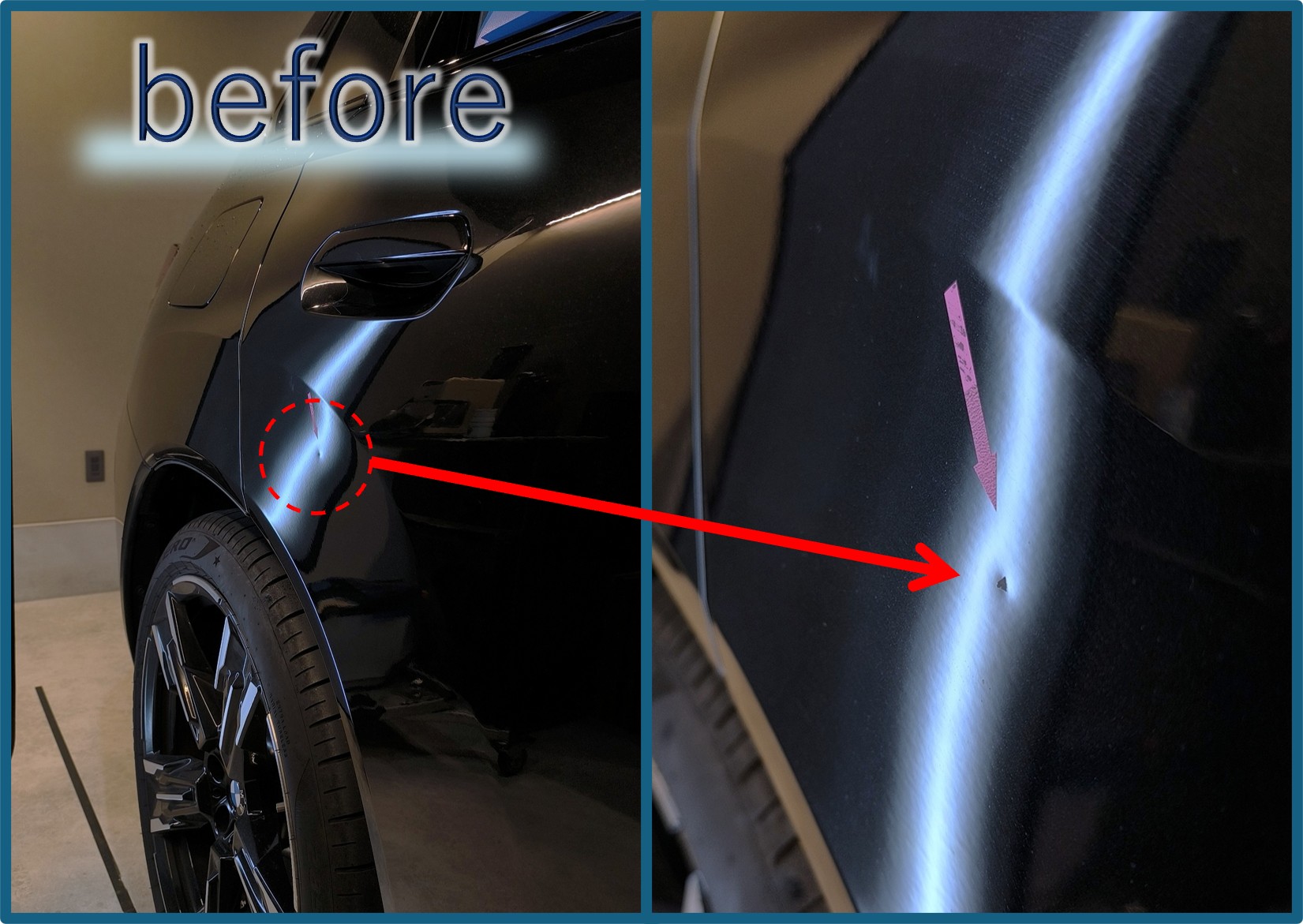 ドアハンドルの下、ホイールアーチに沿って平らになっている面に凹みができています。