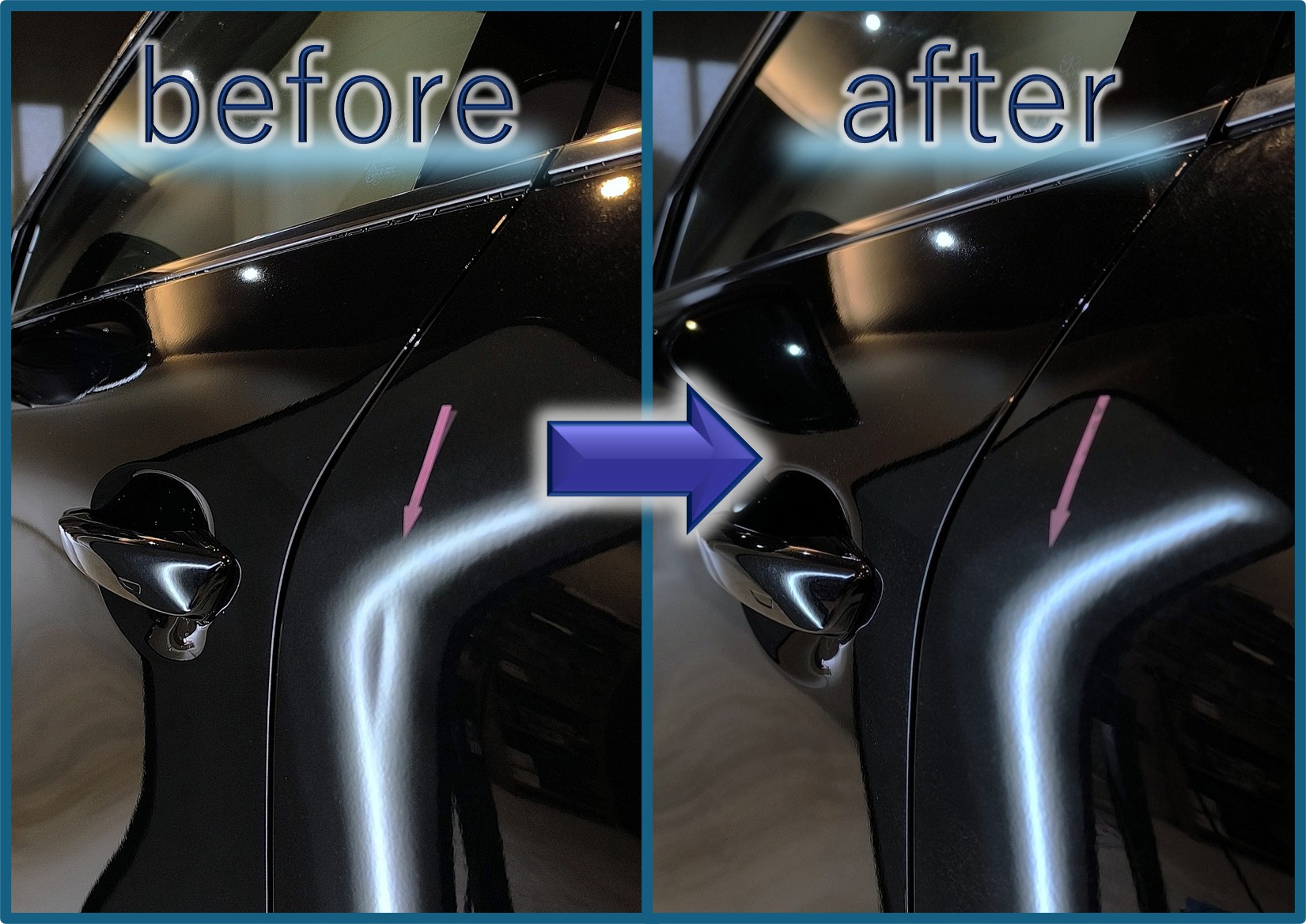 1時間ほどの施工でこの通り。凹みもスジも無くなって、元の曲面が復活しました (^^)/