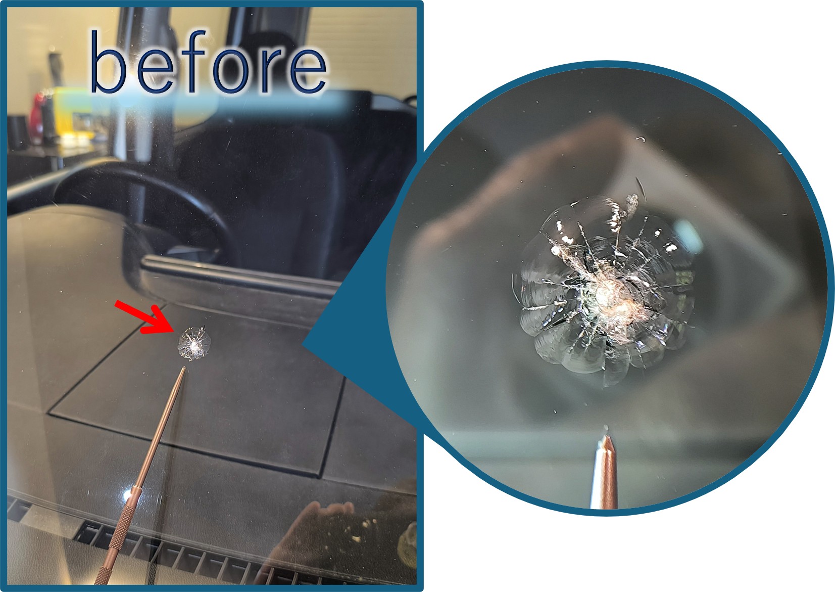 周囲に花びら模様のように見えるものは全てガラス内部で剥離が起きて発生している面割れです。ガラス内部に空間ができて空気が入ってしまっているので、ここを全てリペア樹脂で満たさなければいけません。