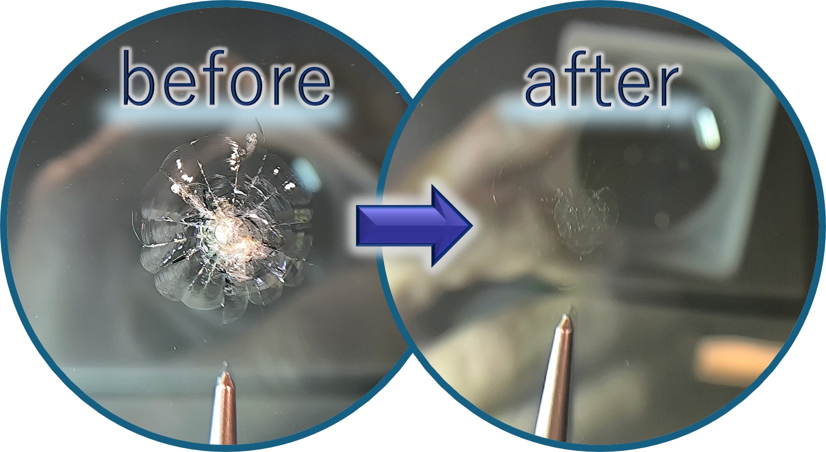 これで強度が高まり悪化リスクは大幅に低減。ガラス交換を回避できたので、このまま今まで通りお乗りいただけます。
