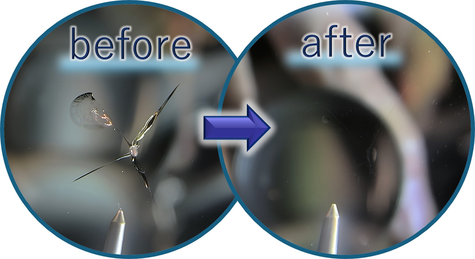 リペア樹脂で埋め固めたことでヒビだった部分は透明の線になり、2つの衝撃点は2つの水滴のような痕跡になりました。