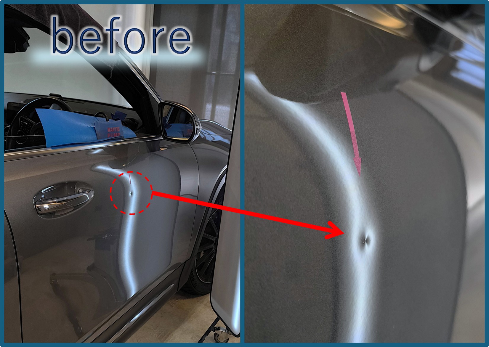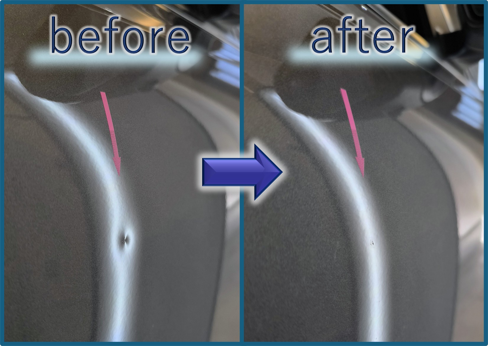 デントリペアは裏から精密に押し出して直していくという工法なので、再塗装やパテ埋めは一切行いません。したがって、元の塗装のまま。